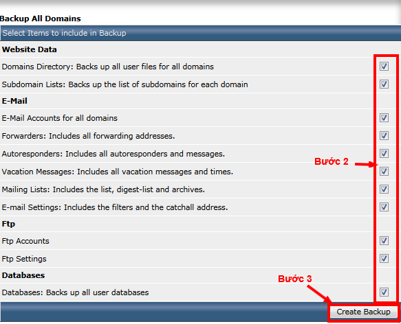 Bước 2 và 3: Lựa chọn các mục nào bạn cần backup, tick vào và chọn create backup: