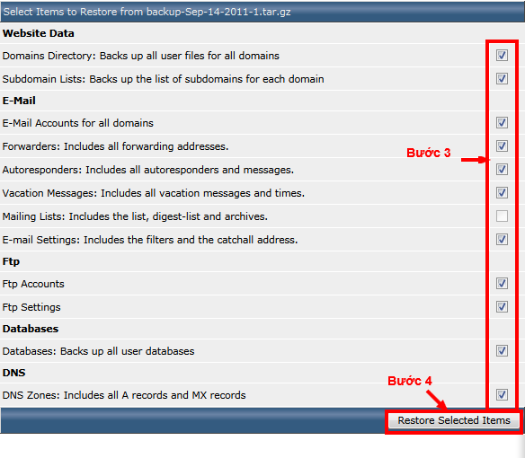 Bước 3, 4: Bạn lựa chọn các mục cần restore nhé.