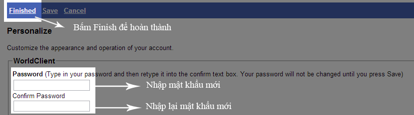 - Bước 4: Cập nhật lại mật khẩu mới và click nút Finish để hoàn tất